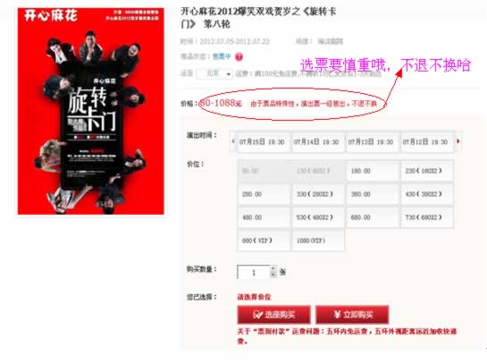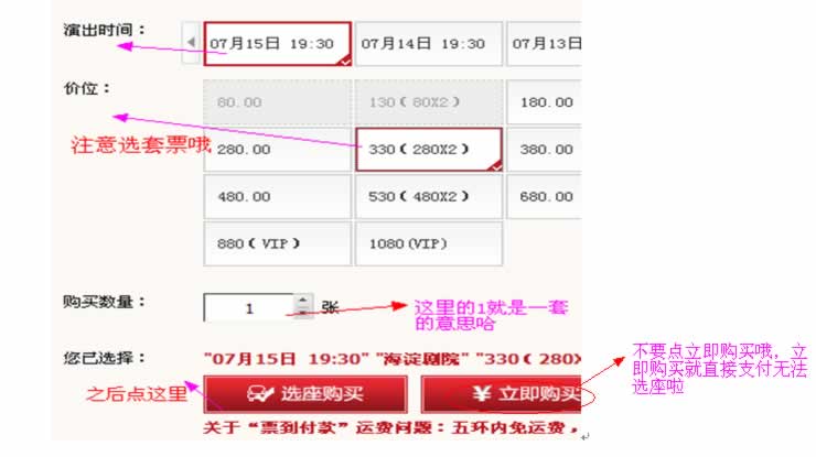 选好演出时间、套票、数量之后进行选座购买
