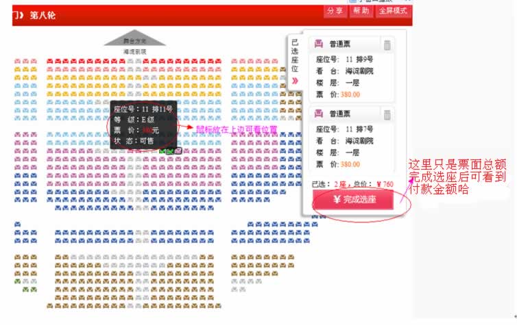 选座购买后出现下面页面,选好座位后在右边点完成选座